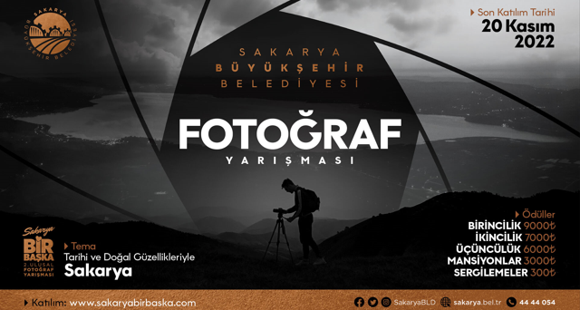 Sakarya Büyükşehir Belediyesi tarafından düzenlenen ‘2. Ulusal Sakarya Bir Başka’ konulu fotoğraf yarışmasına başvurular devam ediyor. Sakarya’nın tarihi ve doğal güzellikleri ile kültürel mirası ve sosyal yaşamını konu alan yarışmaya başvurular sürerken, son başvuru tarihi olan 20 Kasım’a kadar yarışmaya katılım sağlanabilecek. Profesyonel ve amatör alanda tüm fotoğraf severlerin katılabileceği yarışmanın resmi
